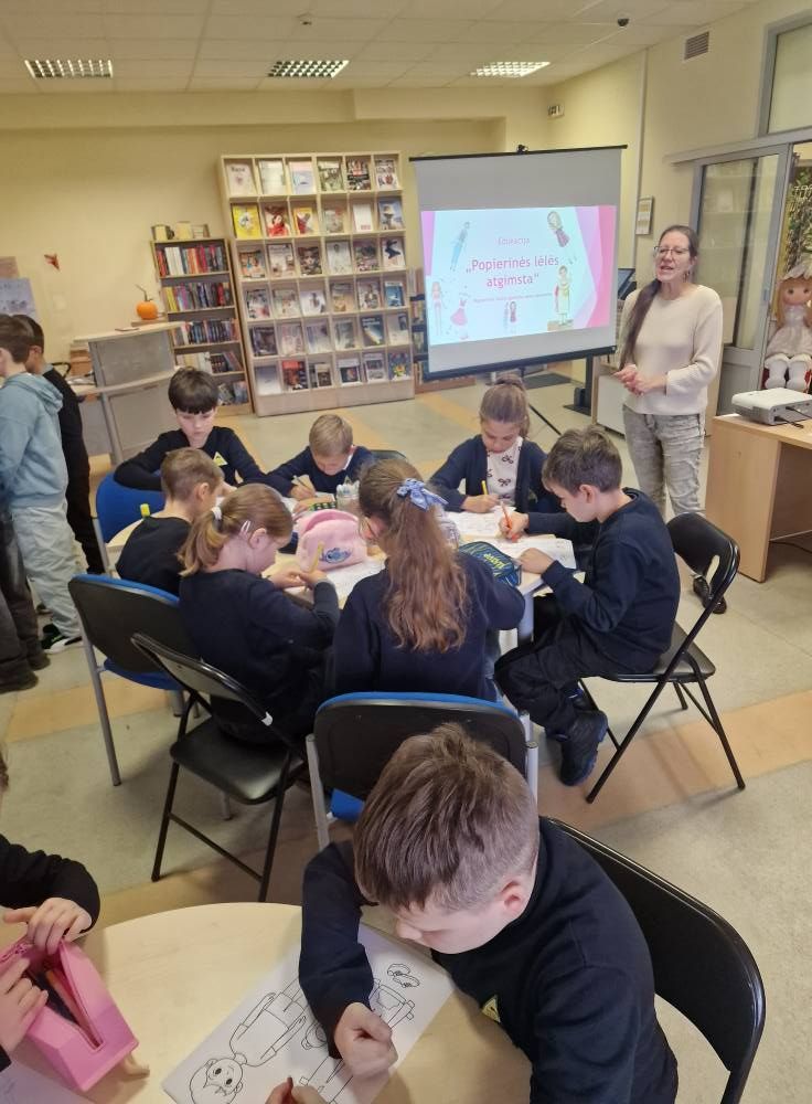 Mūsų mokyklos mokiniai lankėsi Vaikų bibliotekoje, kur vyko edukacija ,,Popierinių lėlių gamyba".Vaikai apžiūrėjo surinktą pasaulio lėlių kolekciją.Ypač smagu jiems buvo matyti lėles, kurios atstovavo Lietuvą pagal regionus. Po to vaikai gamino savo lėles, spalvino jas ir piešė bei kirpo joms rūbelius. Vyravo smagi, darbinė nuotaika.
